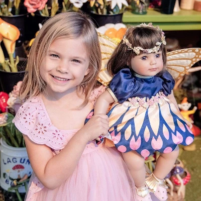 Size: 20″ Adora Doll Light skin tone/Brown hair/Brown eyes Hand-painted face Hand-applied eyelashes Hand-sewn premium quality fashions Made from our soft & silky CuddleMe vinyl vinyl arms and vinyl legs ADORAble & Realistic baby doll face Weighted to feel just like a real baby Fresh baby powder scent Removable clothing Ages 6 and up Beautiful as a butterfly is Adora ToddlerTime Doll Flutterbye Baby! She will make your heart flutter with her ADORAble butterfly-themed ensemble, and lifelike baby details featuring her round brown eyes, her smiling baby lips, and plump blushed cheeks! This 20-inch realistic toddler doll also has brown silky hair with fringes that perfectly frames her sweet ADORAble doll face. Flutterbye Baby is stunning in her beautiful fairy dress detailed with flowers and gold leaves in the bodice, buttercup yellow baby bloomers underneath, partnered with gold studded pink shoes, and a flower wreath to accessorize her already perfect hair. Adora ToddlerTime Doll Flutterbye Baby is a toddler doll gift set with a 20″ realistic doll completed with a colorful butterfly ensemble. This Adora doll has a weighted cloth body with a movable head, and vinyl arms and legs crafted from our baby powder-scented Cuddle Me Vinyl which is soft silky, gentle, and feels more like a real baby, making this realistic doll perfect for the little hands to snuggle and play with! The best is, she also comes with her own traditional diaper, helps develop social skills while engaging in nurturing, pretend play! Makes a perfect gift for ages 6 and up. Browse Adora ToddlerTime Collection for more ADORAble lifelike toddler dolls and our PlayDate Accessories for a more realistic fun play in your nursery!