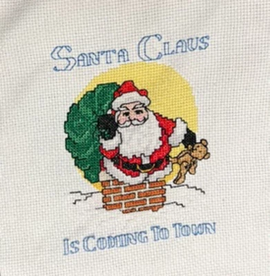 - The bib has a cross stitch panel of Santa with the words Santa Claus Is Coming To Town