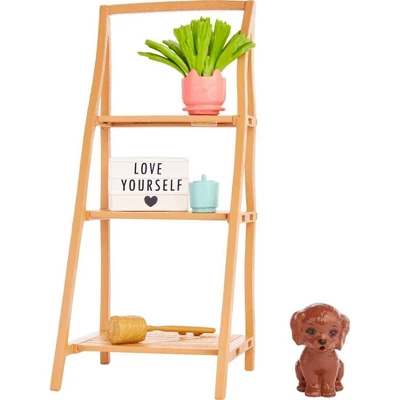 - Barbie doll has everything needed for a relaxing soak in the tub: a bathtub and bath tray, shelving unit, towel, large brush, small brush, lotion bottle, soap, plant, candle, sign and puppy