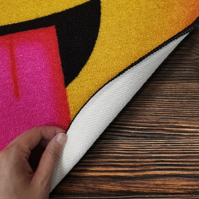 Art does not have to be displayed exclusively on walls. Let your floors show off some flair too! Add happiness to your home dcor with this beautiful emoji area rug. its yellow color will fit in with any dcor theme, and make it as a unique gift that’s great for any occasion. Machine tufted with durable synthetic fibers, it has a soft and comfortable texture, does not shed, and is easy to clean. Its low .25 pile makes it ideal for high traffic areas of your home and will not obstruct doorways. A slip resistant latex backing keeps the area rug safely in place. Due to the hand finished nature of this product, please allow for slight variations in size and/or shape. Whether you display it in your bedroom, play room, or nursery, itll bring your home dcor to the next level.
