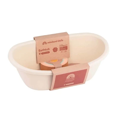 - Baby bath tub made of bioplastic from sugarcane for bathing Miniland dolls of up to 16-3/8″. A rainbow-shaped sponge comes with it.