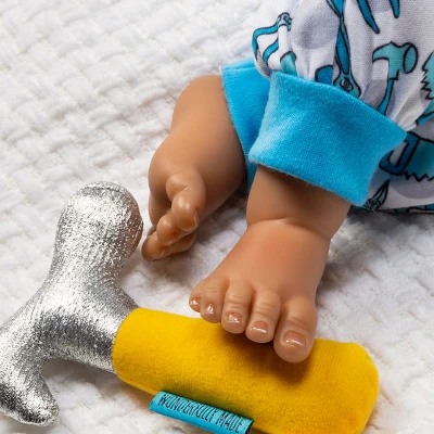 Its hammer time! Wonderfully Made is dressed in a cuddly soft onesie screen printed with Wonderfully Made and a measuring tape that reads MY MOM RULES. His bib and pants have a playful blueprint that resembles everyones toolbox. Hell be by your side through any project and is always willing to lend a helping hand with his plush hammer.