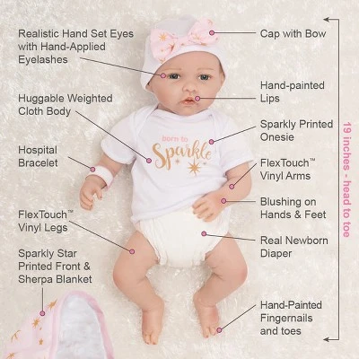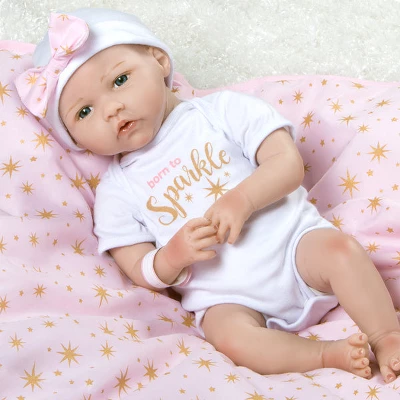 Born to Sparkle is ready to be center stage and in the spotlight! This towhead sparkles with delicate features and bright blue eyes.Her head, arms, and legs are made of the innovative silicone-like FlexTouch vinyl which feels wonderfully soft and so lifelike, just like a real reborn baby girl! Her body is cloth and weighted for that real baby feel. Youll love running your fingers through this little girls head of light blonde hand-applied faux mohair while staring into her bright handset eyes with hand applied eyelashes. This realistic baby girl doll also features hand-painted fingernails, toenails, and lips. She is bundled up tight in a pink receiving blanket with gold star design, and a white faux fur lining.Born to Sparkle is printed on her white cotton onesie and captures her vibrant personality perfectly. She arrives with a Special Delivery gift tag, authentic hospital bracelet, birth certificate, and even a real diaper!Born to Sparkle by Jannie de Lange is part of Paradise Galleries precious Baby Bundles collection, a group of 7 ultra-realistic baby dolls that look like true newborn baby dolls. Each Baby Bundle is handcrafted in unbelievably lifelike silicone-like FlexTouch vinyl, featuring faux mohair and hand-painted details. This FlexTouch vinyl technology makes her feel just like a silicone baby doll. Every newborn bundle is outfitted in a white cotton onesie with themed saying printed on the chest, and a cute cap. These new arrivals also come with a cozy, cushiony soft receiving blanket tied up with a bow, gift tag, a customizable hospital bracelet, birth certificate, and diaper. All Baby Bundles also come in a Collectors Box and a signed Certificate of Authenticity with the artists signature.Browse our collection of reborn doll accessories, including our popular Reborn Doll Diapers and customer-favorite Baby Doll Magic Bottles! Our doll accessories are perfect for bonding with your realistic baby doll or completing your Paradise Galleries gift set.