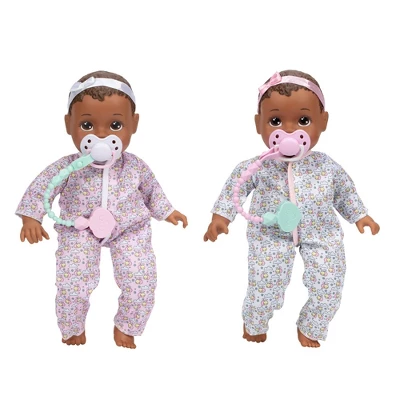 Your little one will adore doubling baby doll fun time with their very own set of Perfectly Cute 14ā My Sweet Baby Doll identical TWINS! Dolls comes delightfully dressed in matching bumble bee printed onesies in pink and in white. Each My Sweet Baby twin features a softānācuddly body with easy-to-wipe-clean, durable hard plastic arms, legs, & head. Coordinating pacifiers, milk bottles, pacifier clips & satin ribbon headbands also included! Theyāre the identically sweet addition to every baby doll collection!