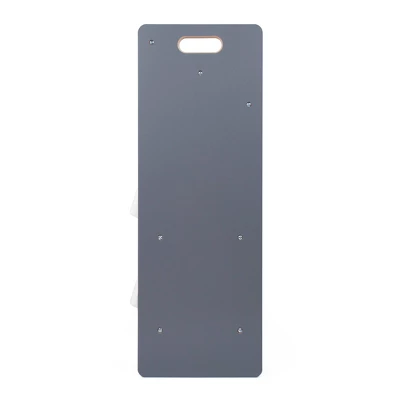 - Gray wooden finish with white toy bins and book storage pockets.