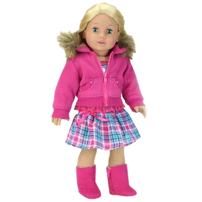 - INCLUDED: One hot pink sweatshirt with faux fur collar sized for 18 inch dolls.