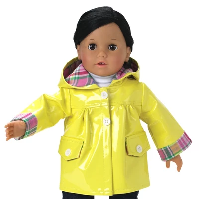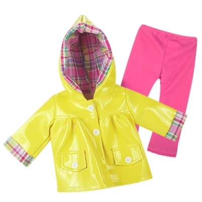 Your little one and their doll will be hoping for rainy days with this absolutely adorable set. The light pink tone of raincoat’s plaid lining perfectly balances the bold yellow tones of the jacket and boots, while the hot pink leggings keep the outfit bright and cheerful. Comes with raincoat, boots, and leggings. Perfectly styled to fit Sophia’s dolls and other 18″ dolls from most leading brands (doll not included).